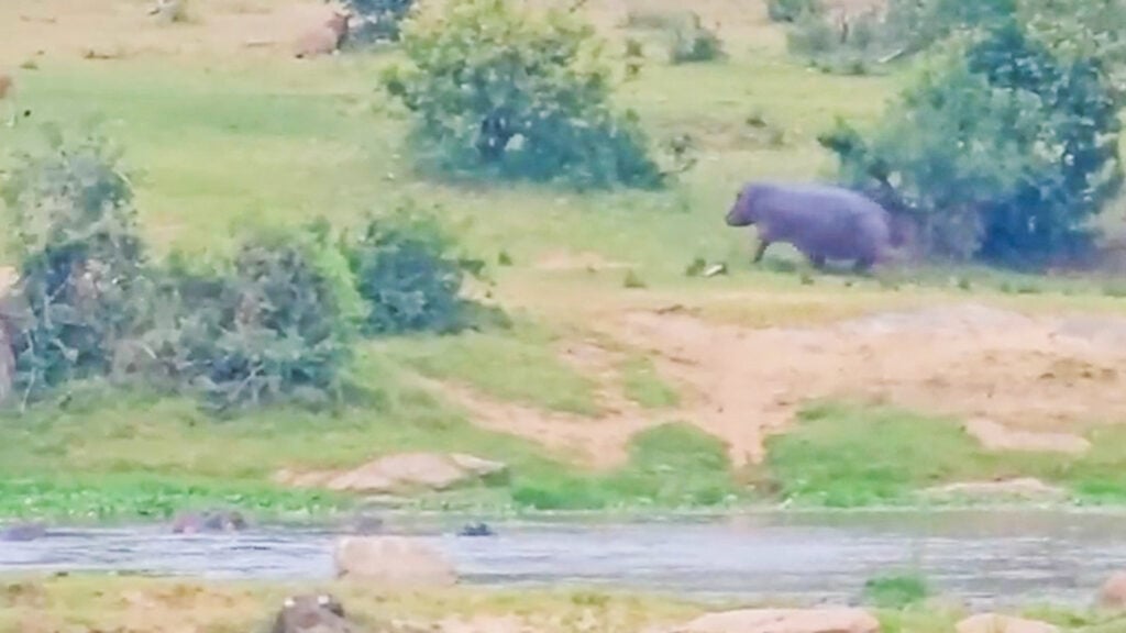This remarkable sighting took place beside a river, which explains much of the hippo’s behaviour. Hippos are extremely territorial in water and along riverbanks.