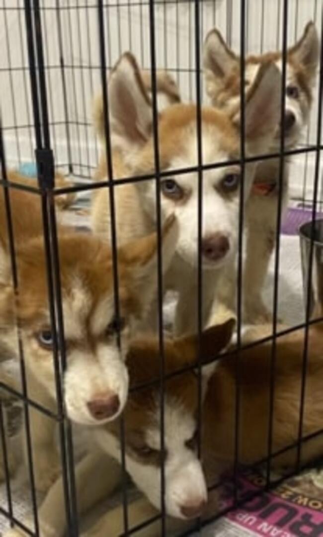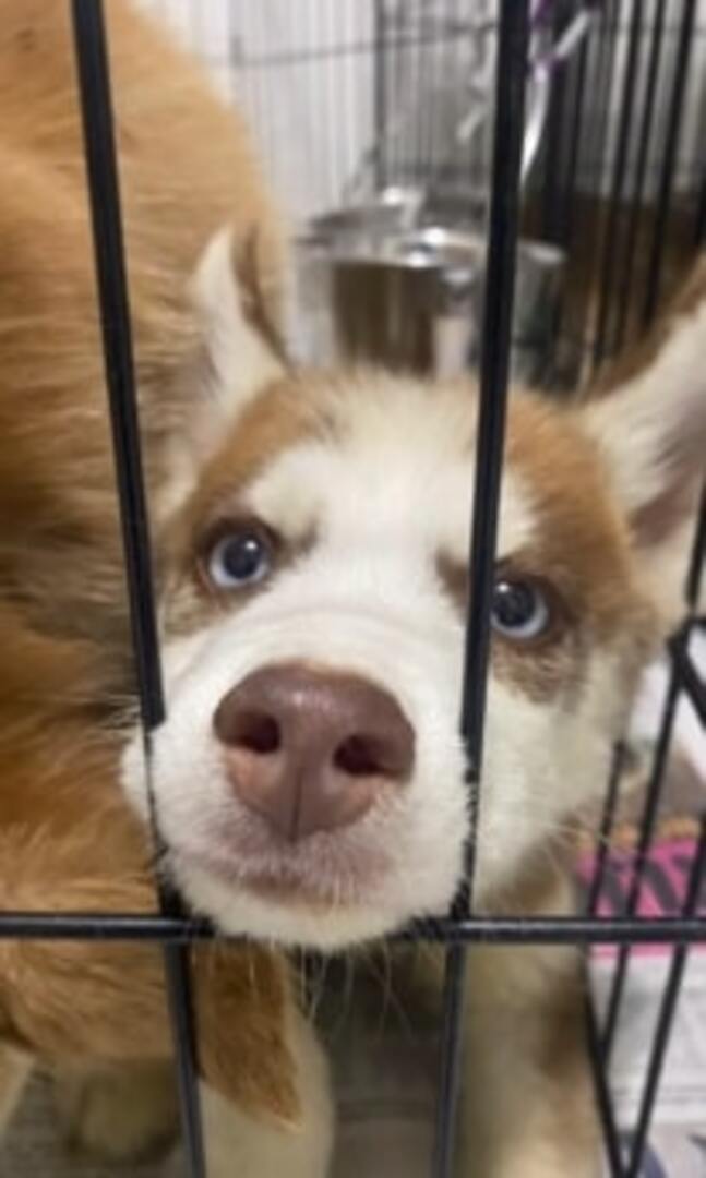 Cotton Jean led them directly to a nearby yard and a scene of absolute horror: his frail mate, a female dog named Lavender, was locked inside a cage, severely malnourished and trembling. Next to her, four tiny Husky puppies were huddled together in another cage, their bodies weak from hunger and fear. This was not neglect; this was calculated, cruel imprisonment.