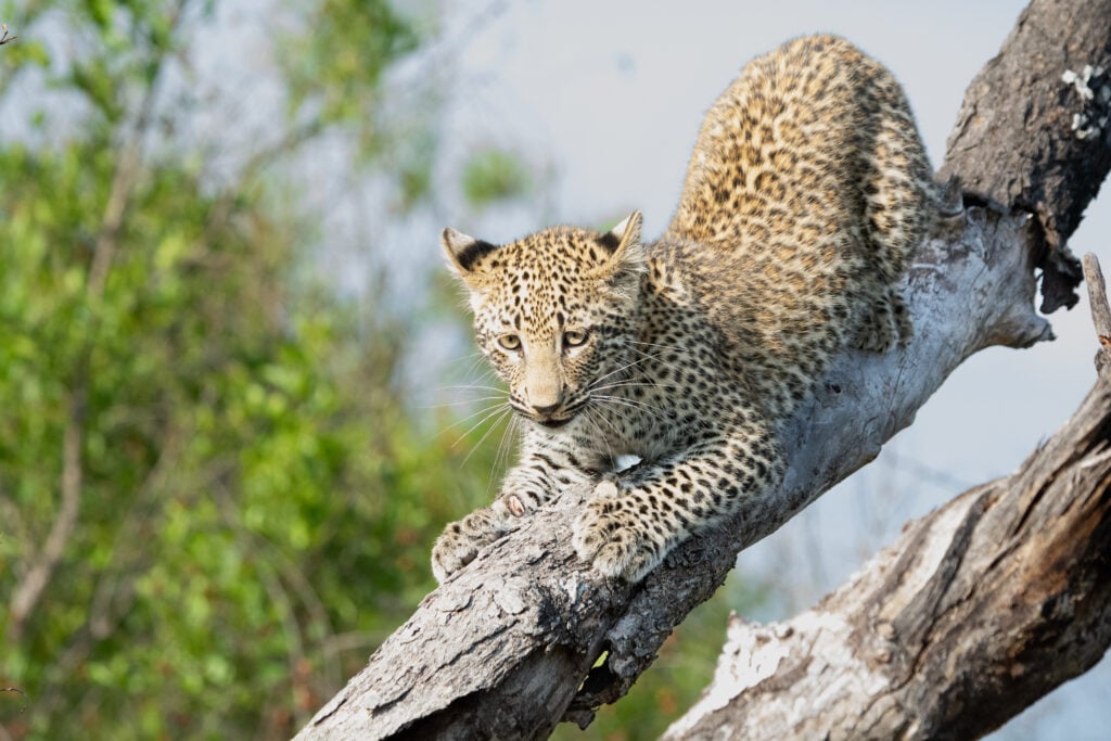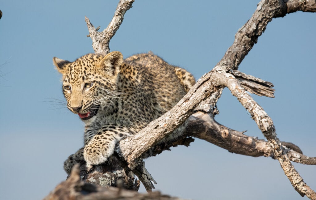 However, leopards are unmatched climbers, and the mother had chosen her refuge well. She hissed and snarled softly to reassure the cub and to assert her dominance.