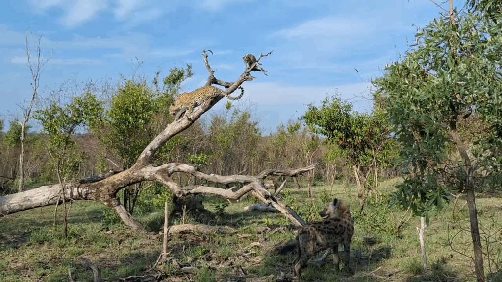 The leopard mother wasn’t about to let them have their way and stood as a sentinel on a branch of the tree, positioning herself between the cub and the hyenas, so that they had no way of getting to her cub without going through her.