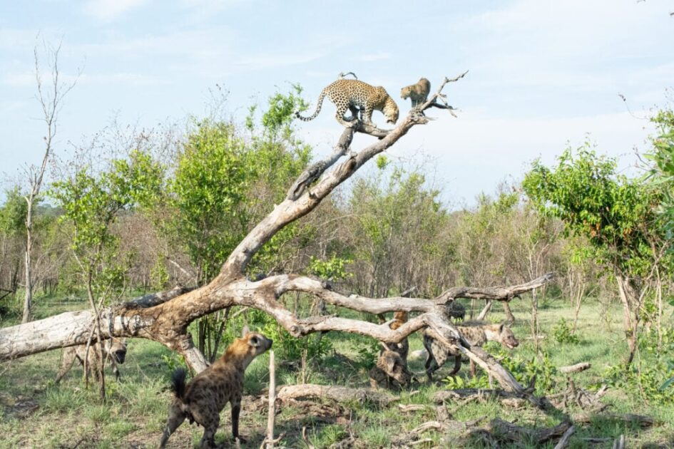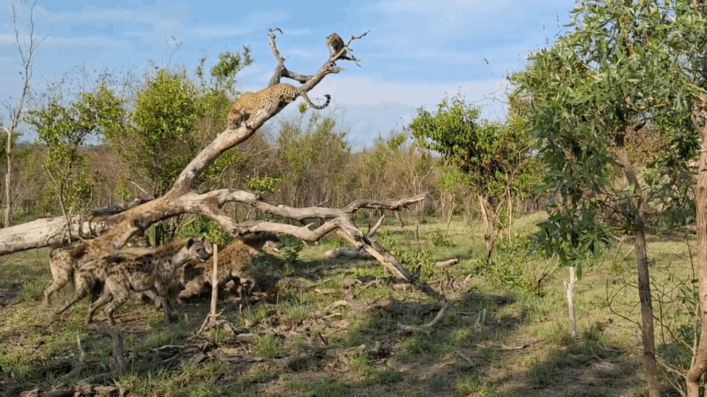 The opportunistic hyenas had gathered around a fallen tree where the leopard and her cub had taken refuge.