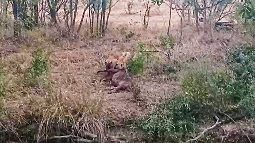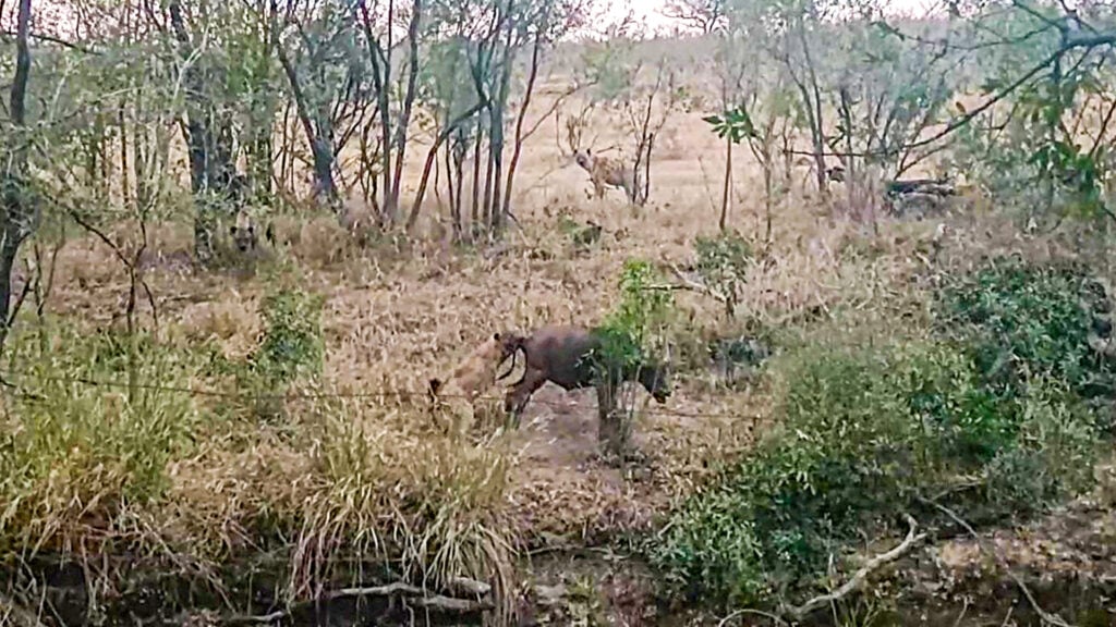 A few seconds after the start of the video, one hyena made its move, darting forward and clamping onto the calf’s tail. The calf let out a loud, desperate cry for help that echoed unanswered across the bush.