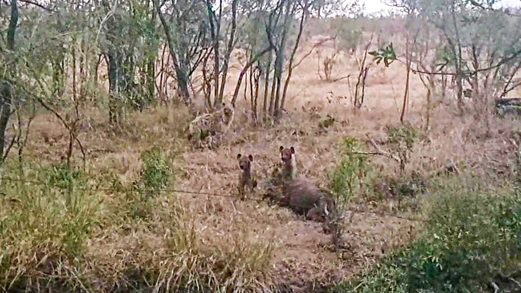 By this point, the calf is clearly no longer alive, and very little remains of it. Hyenas are efficient consumers, capable of eating skin, bone, and tissue that many other predators leave behind.
