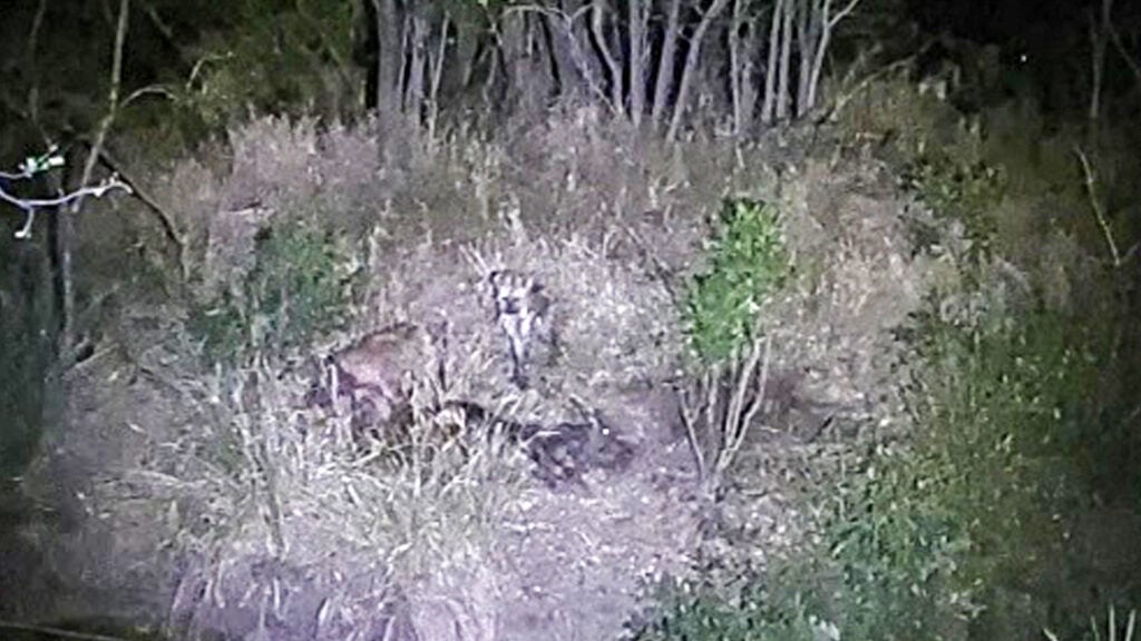 The video later cuts to nighttime, where the scene continues under the light of a flashlight. Though visibility is poor, it is clear that the hyena pack remains at the carcass, steadily consuming what is left.