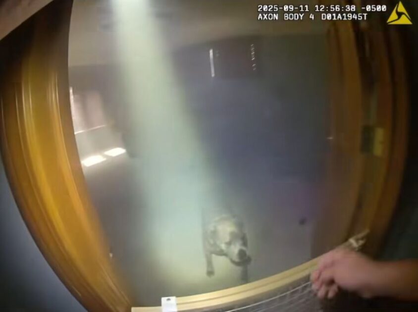 Officer Ely tried guiding him out by taking hold of his collar, but Oakley made a different choice. Instead of going straight to safety, he turned and headed toward another room, leading the officer with him.