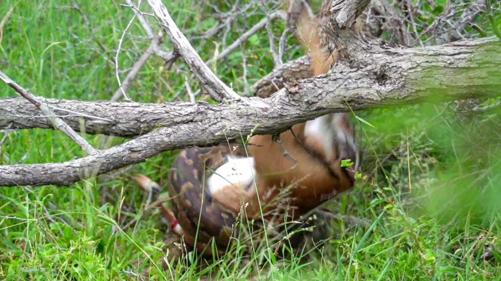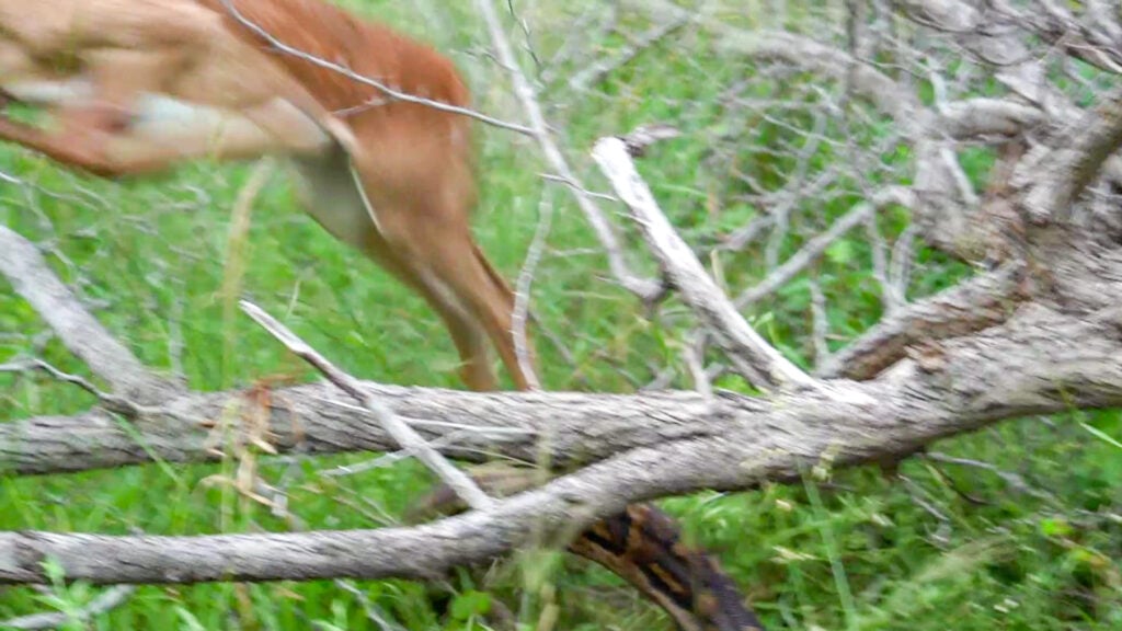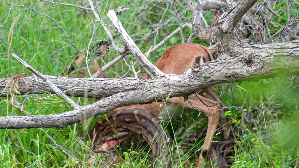 This python was situated under a fallen tree, which was not only a perfect hiding spot, but also assisted in entrapping the impala. Impalas are common targets, especially juveniles or weaker individuals, as they have predictable movement patterns.