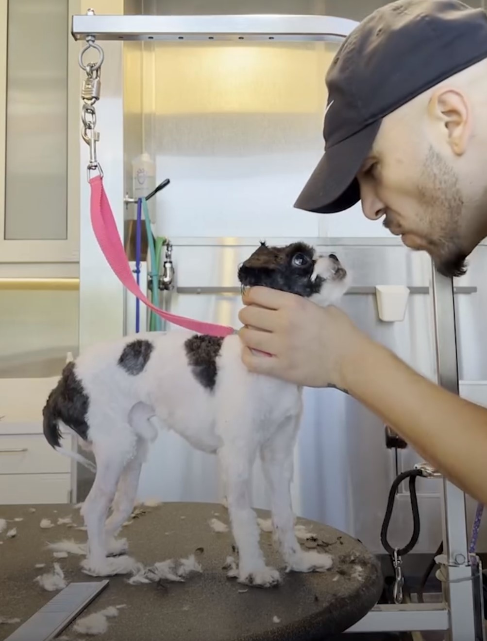 Mario approached the task with patience, shaving away the mats little by little. Each careful pass of the clippers brought Panda closer to freedom.