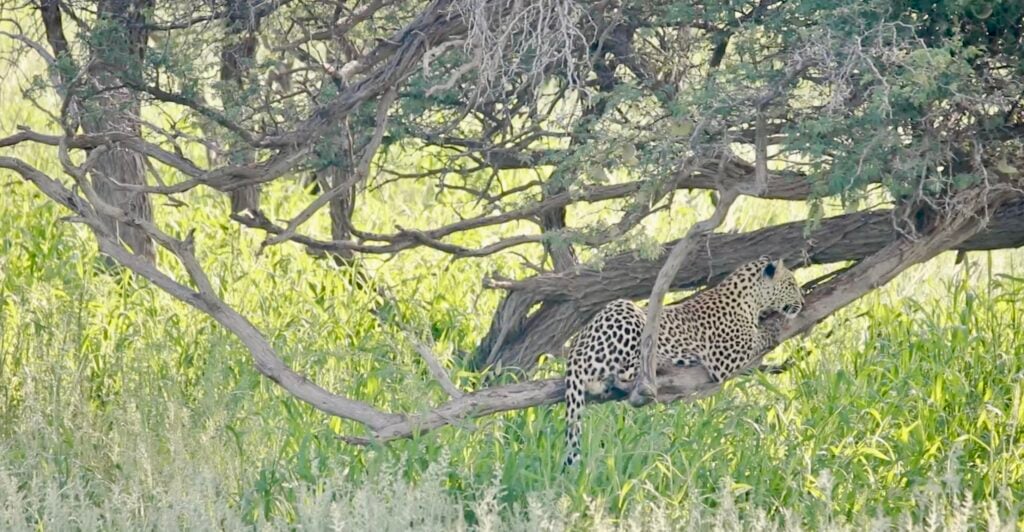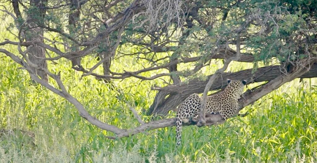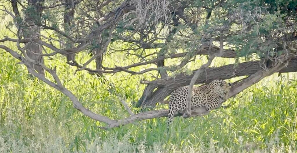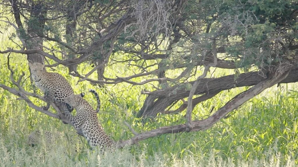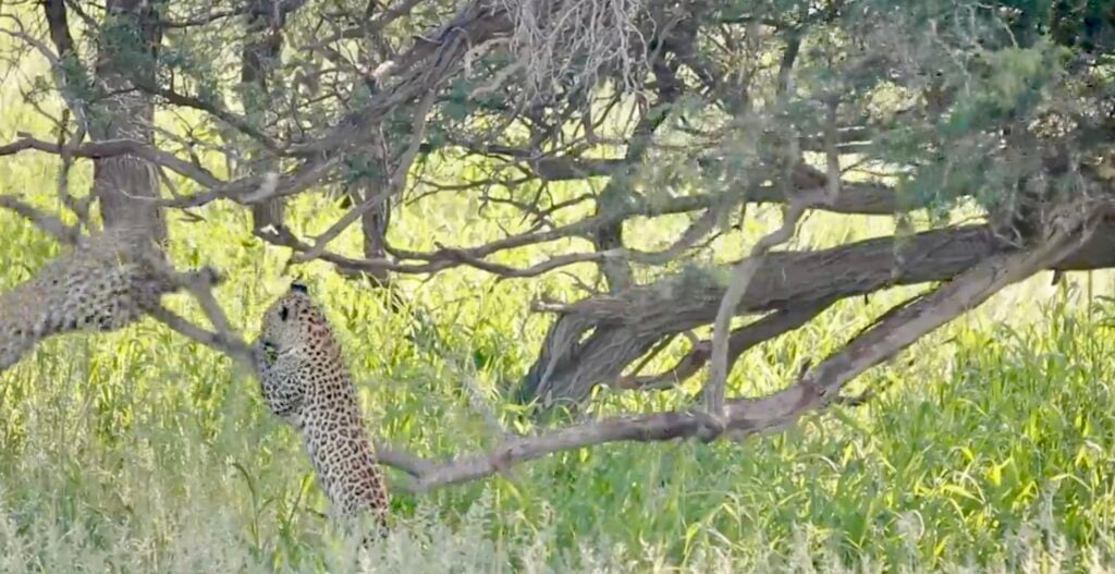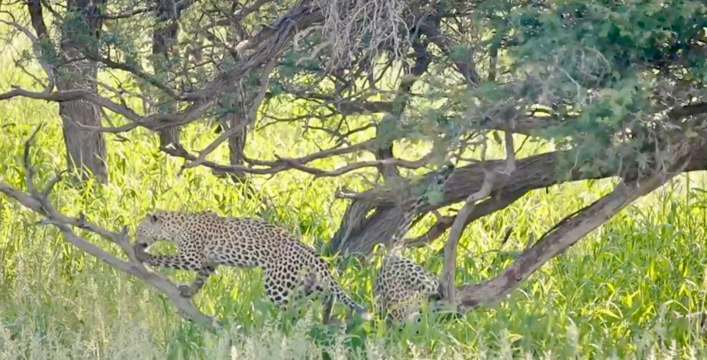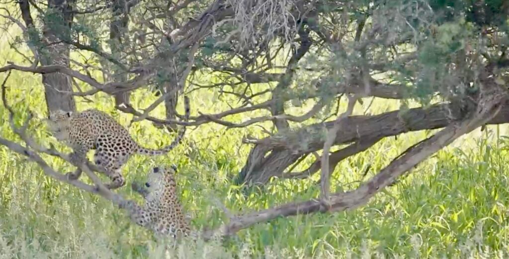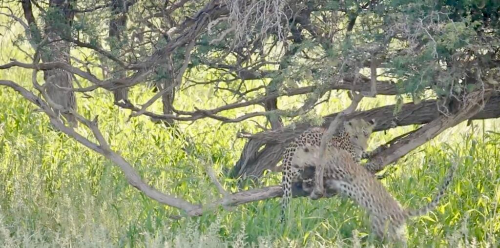 In the shade of the African bush, all initially seemed calm. One young leopard cub had claimed the perfect perch on a tree branch, basking in peace and feline glory.