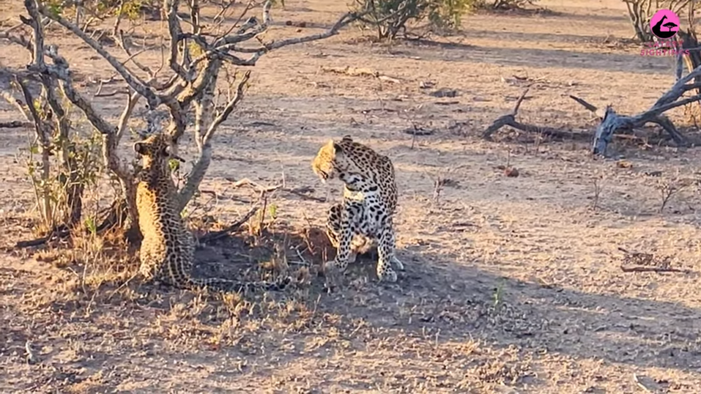 The leopard mother showed extreme patience while her jovial cub practiced climbing a small tree in the reserve. The cub playfully climbed the tree with success, however, owing to the tree’s size, had trouble staying in its branches.