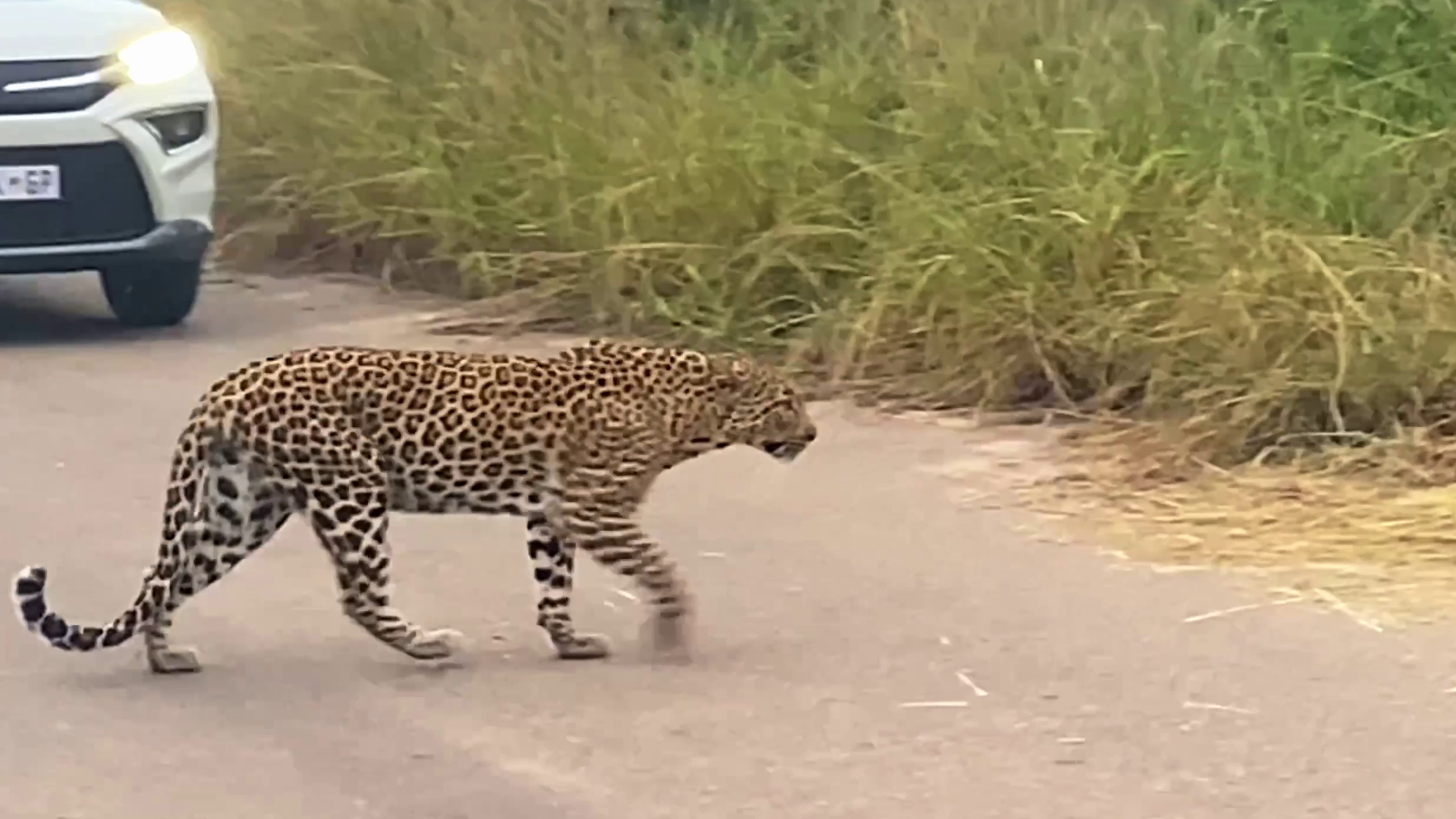 As Excellent’s video begins, a sight most visitors to the park dream of greets us. We see a female leopard crossing the road.