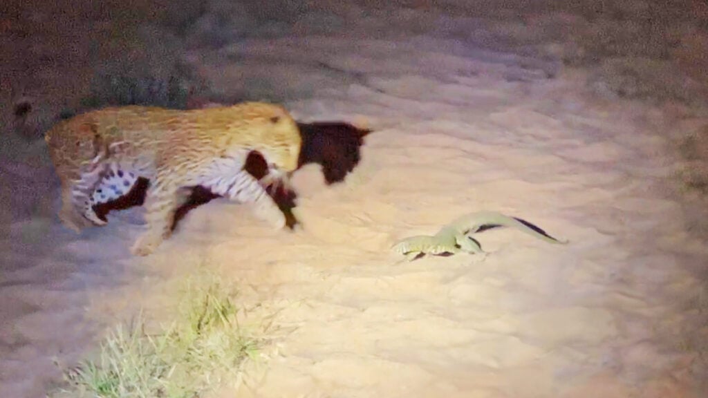 In the cover of darkness, the leopard spotted a monitor lizard creeping through the sand. Without hesitation, it attacked its newfound target!