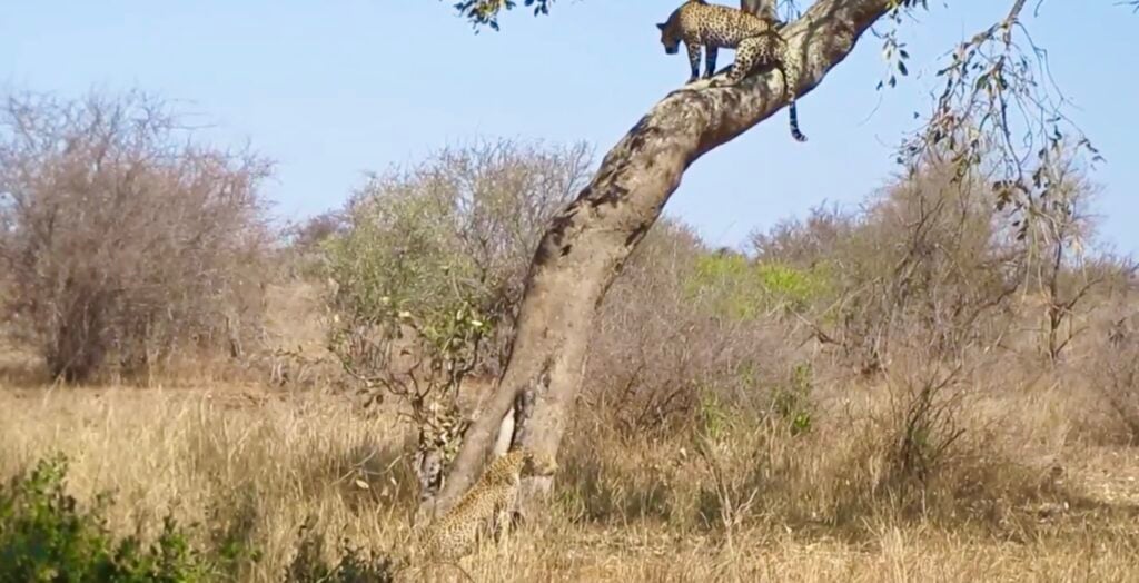 High in a tree, a leopard lounged on a branch, seemingly undisturbed, while below, another leopard approached with slow, deliberate steps. For a few tense moments, the two locked eyes and stared each other down intently.