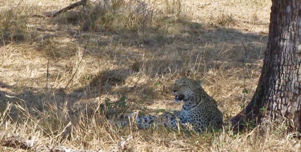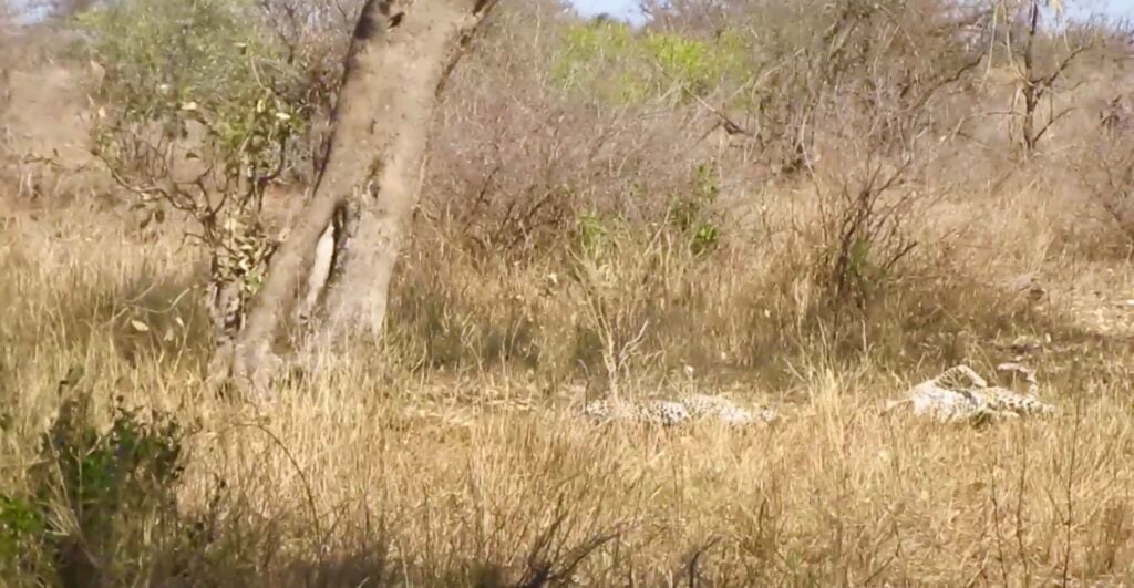 After the brawl, the leopards rested beneath the tree, chests heaving. The leopard on the right, likely the more hurt than the other, took longer to rise.