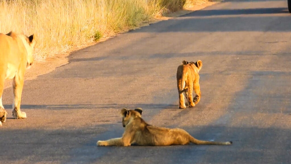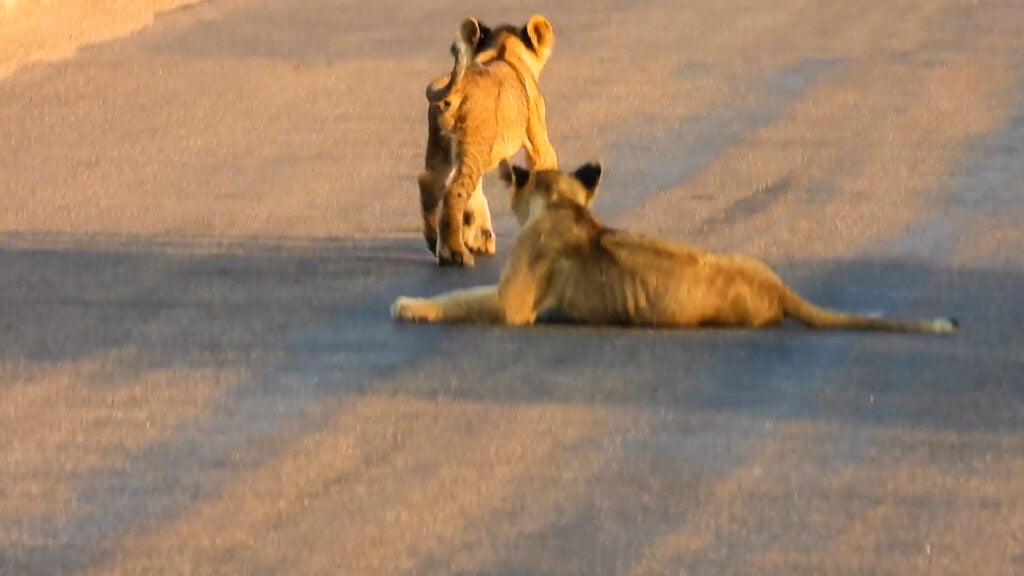 As the video rolls, we see an unusual sight. Two lion cubs are in the middle of a road.