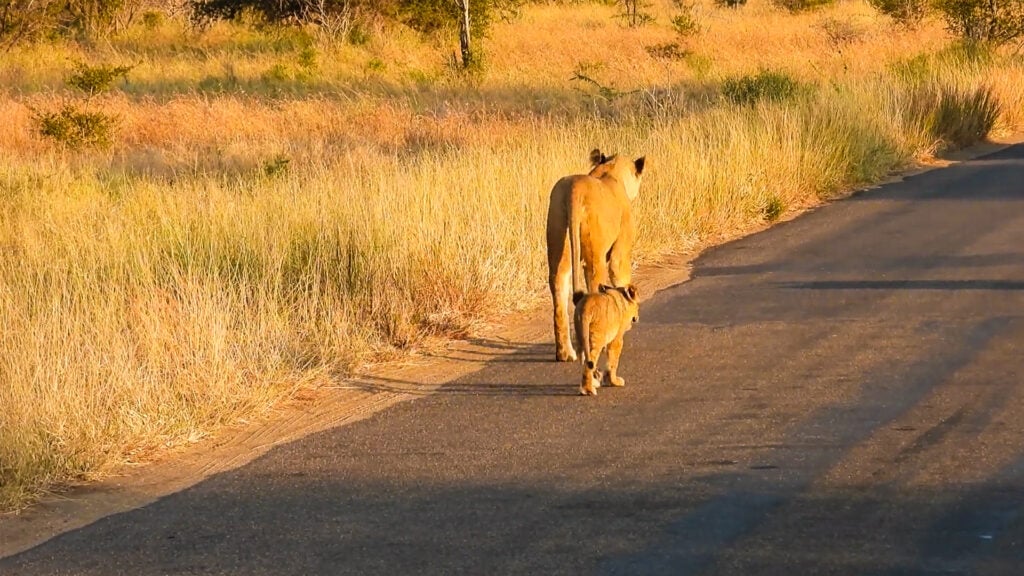 Obviously, this is not just any road. And, while we can’t tell you where the road is, it is safe to assume that it is in a national park, probably South Africa’s Kruger National Park.