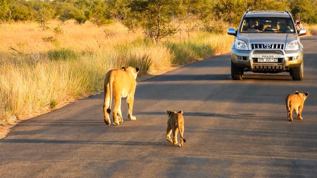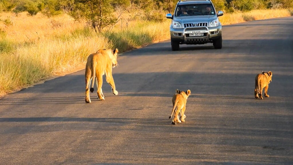 In South Africa’s national parks, all drivers must give right of way to the wildlife. Therefore, it is good to see the vehicle start to reverse to make way for the lions.