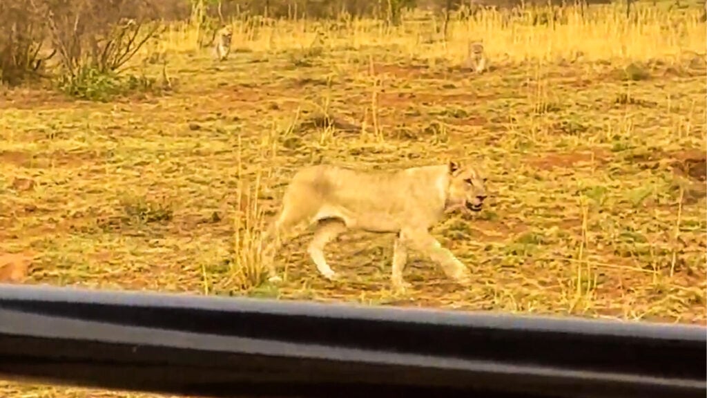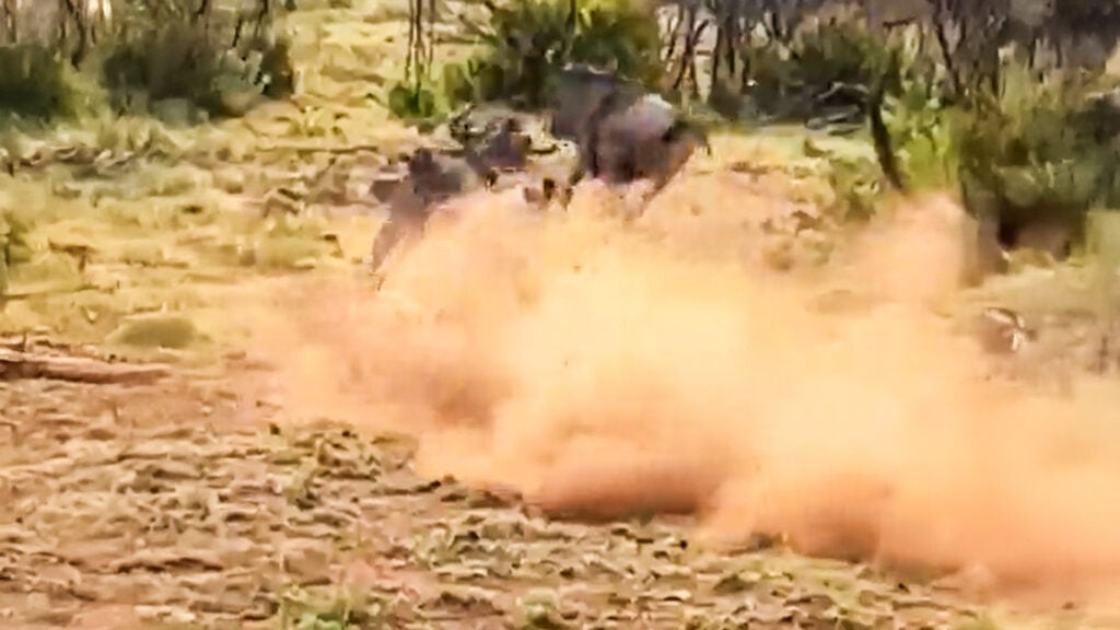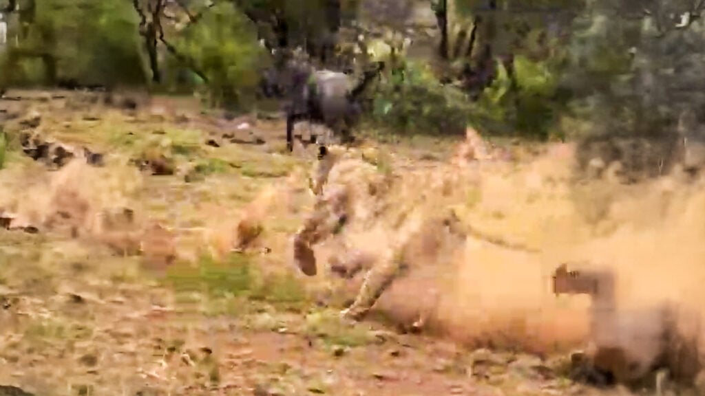 While the wildebeest was seen running behind the bushy outgrowth, it didn’t reemerge. The lion had brought it down.
