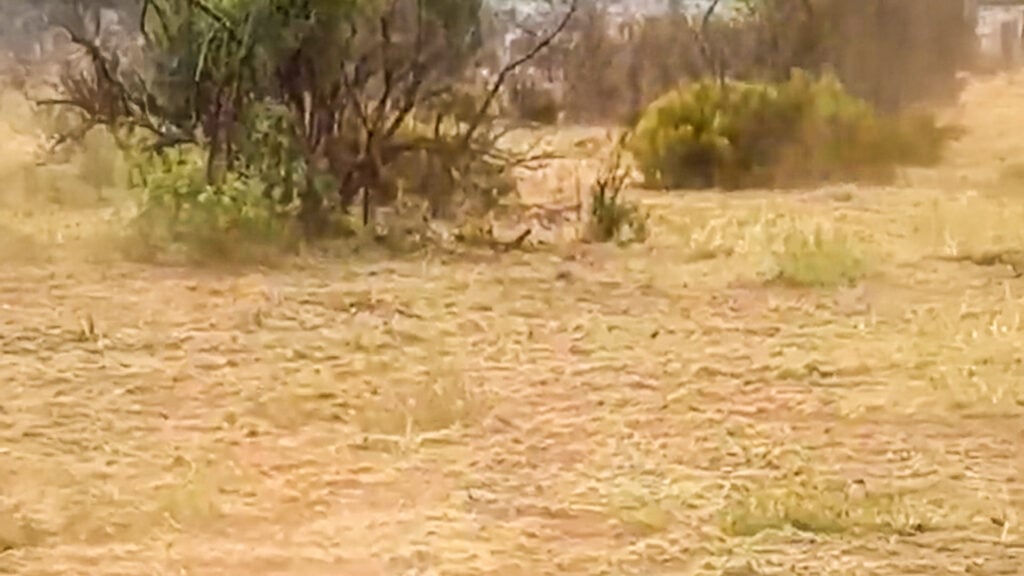 When a lion charges, a wildebeest will try to evade it by running fast and making sharp turns. This wildebeest turned abruptly when it came to a line of bushes. It ran swiftly behind the bushes, kicking up dust in its wake.