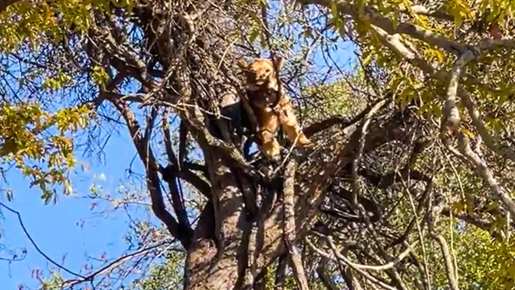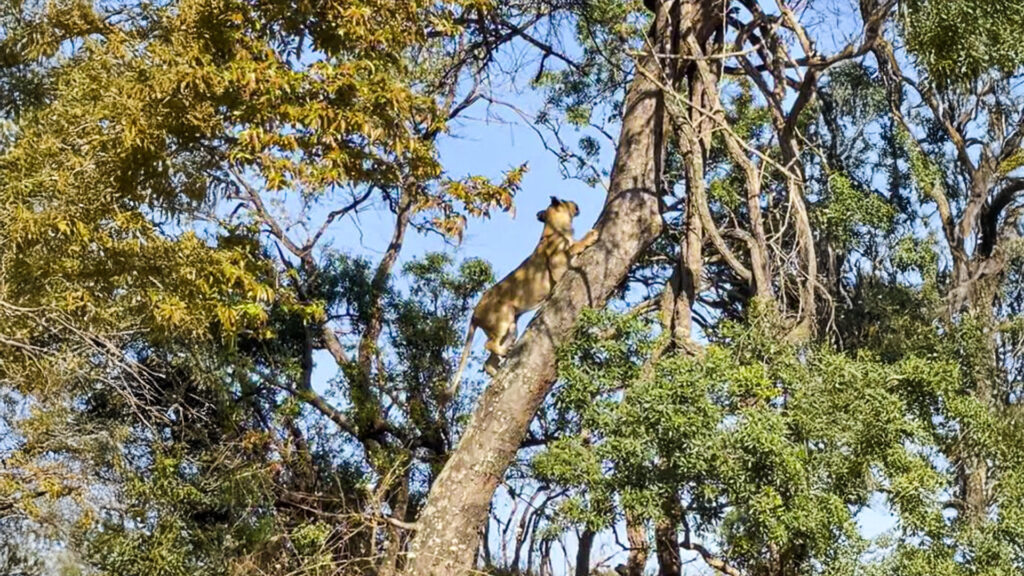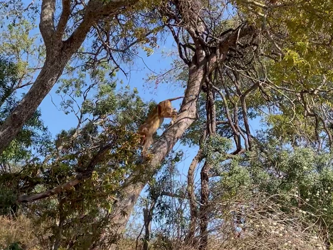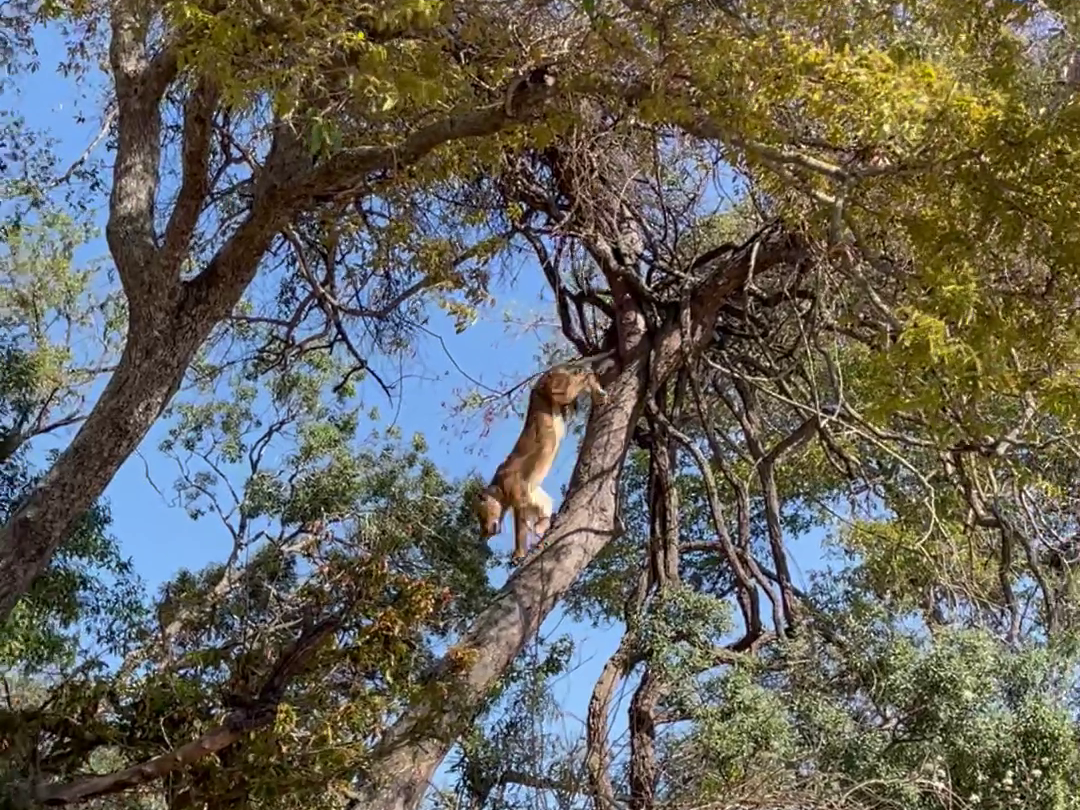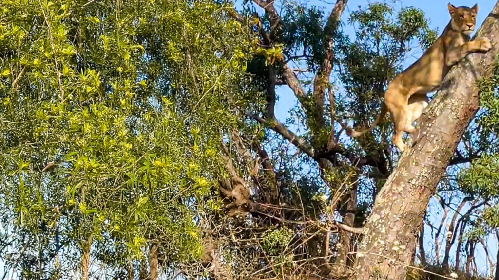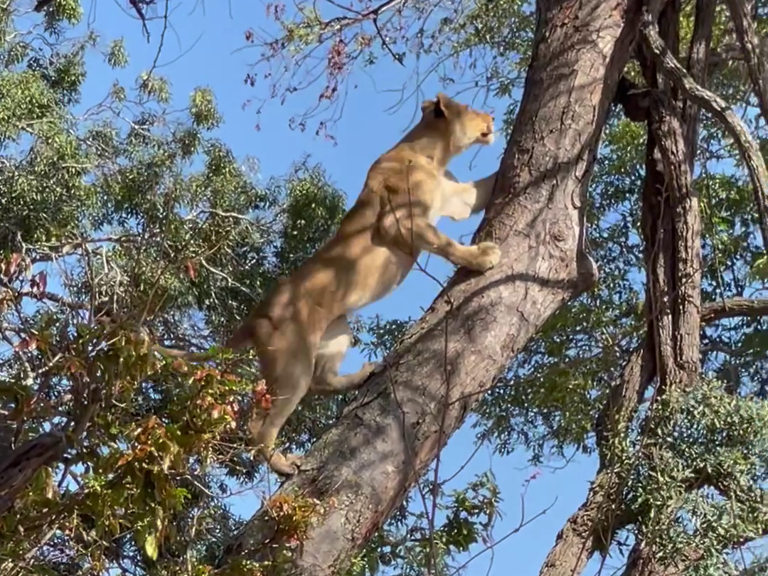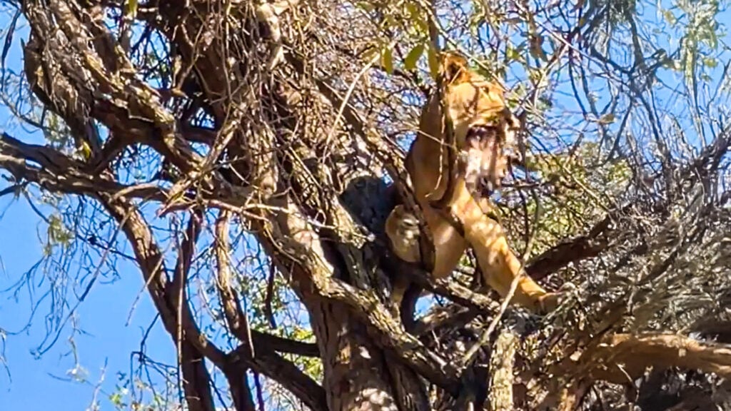 And so, despite having watched her sister’s treetop troubles, it came as a surprise when a second lioness made its way up the trunk. Talk about being a copycat!