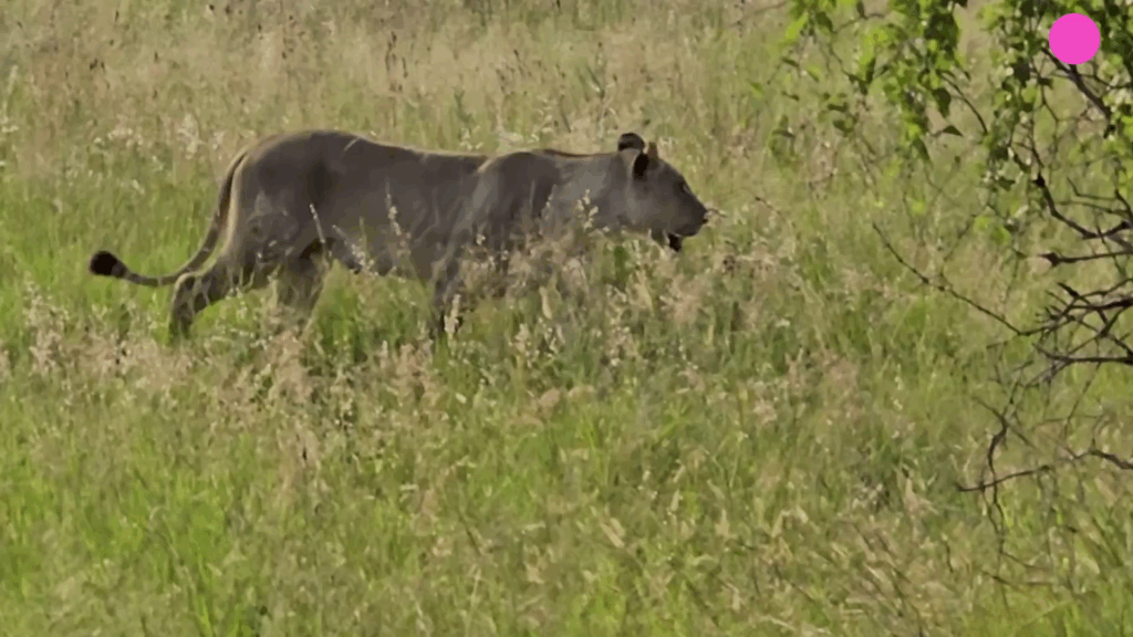 While we don’t know how long the lioness had been away, we join the action as the mother lion walks through the long grass.
