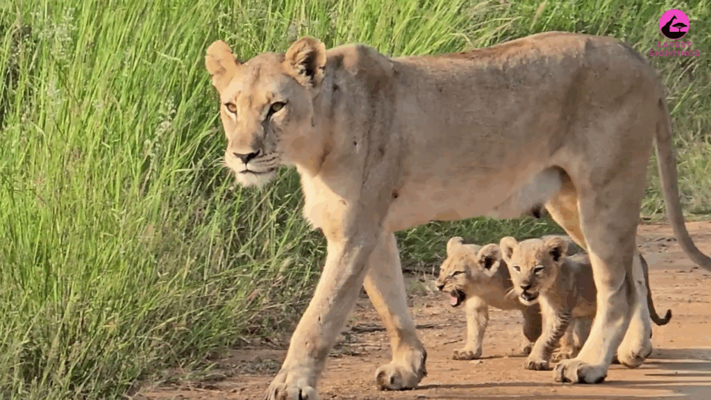 Despite hearing one another, the mother and her cubs have yet to see one another. However, when the lioness comes out onto the road, their chances of seeing one another improve significantly.