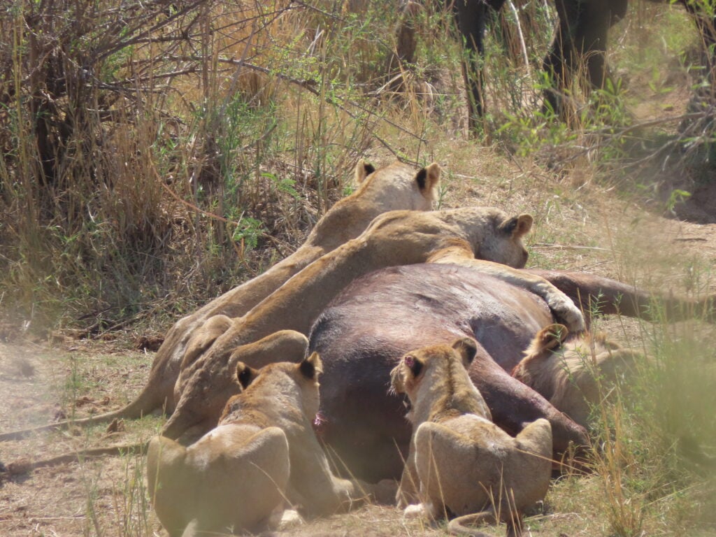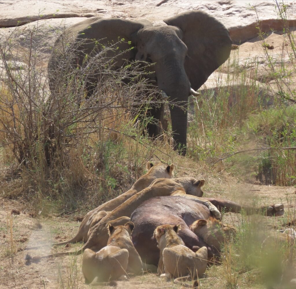 As the buffalo went down, it cried out in anguish, while the lions began to roll it over onto its back. The buffalo’s cry must have stirred some kind of emotional response from within the elephants because they began to wander over in what looked like a cautious intervention.