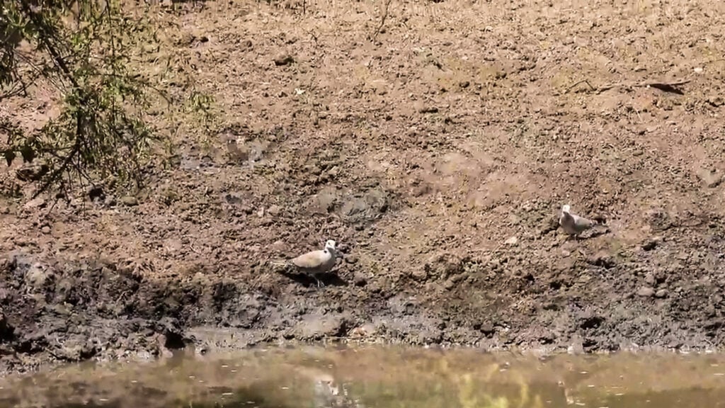 At the beginning of Hayley’s footage, it appeared that the only custodians of the watering hole were two birds that were standing in the mud, being wary of their surroundings.