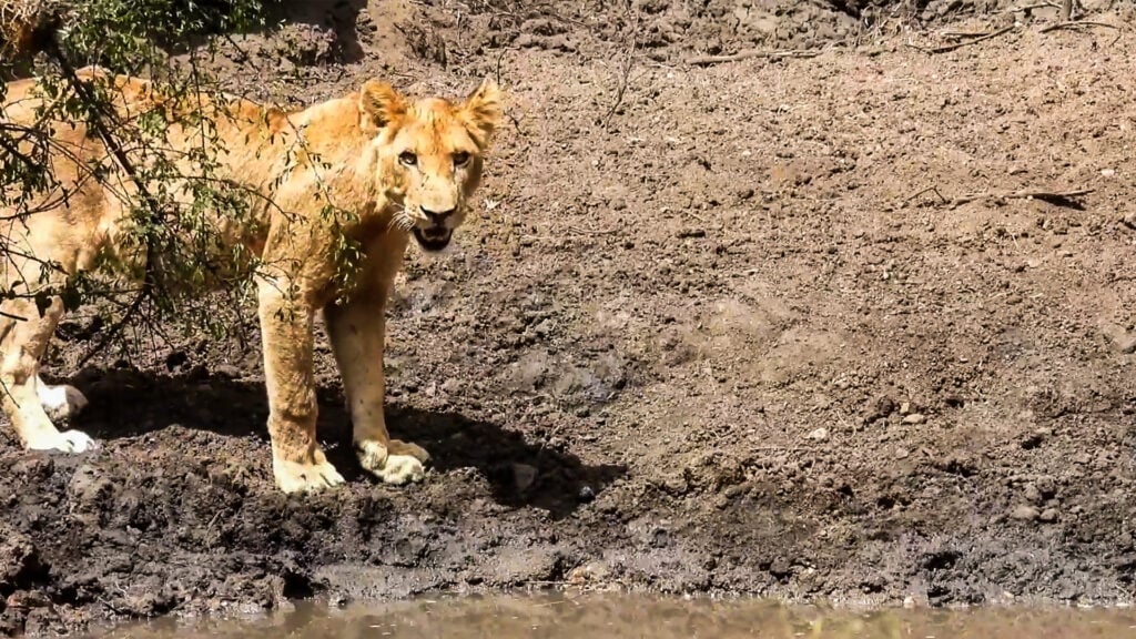 For a short moment, it was only these two lions at the watering hole. The rest of the big cats must have fallen behind slightly on the way to their much needed drink.