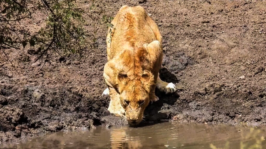 While the first lion was busily lapping up the water, a second appeared and did a very good job of perfectly mimicking the first. Everything from the posture to the behavior was almost completely identical between them.
