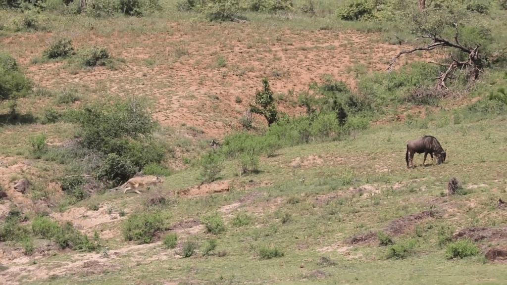 She sprinted out in full view with magnificent strides, and the isolated wildebeest quickly became aware of her presence. Fully aware of the impending danger, the wildebeest ran across the grassland area.