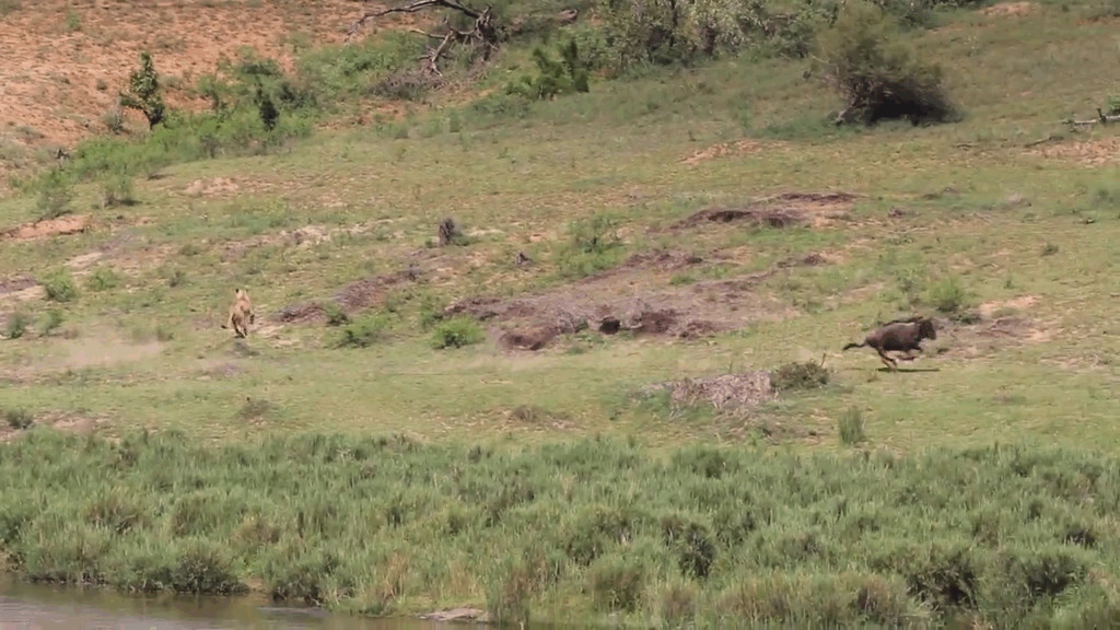 The chase ensued with the lioness in close pursuit of her intended prey. Wildebeests often rely on stamina to overcome pursuing predators, such as this lion.