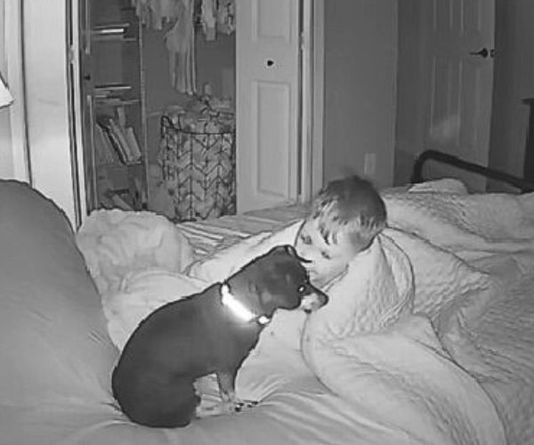 The boy’s mom, Hannah Belcher, later saw the moment captured on the bedroom camera. What she witnessed melted her heart. Her son and the dog were lying face to face, sharing a quiet, intimate moment as if they understood each other perfectly.
