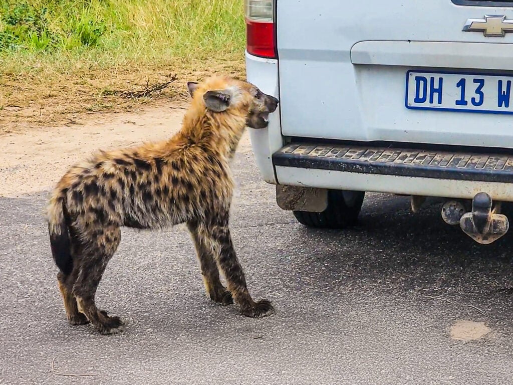 This hyena cub, that Theunisia Swanepoel spotted on the S1 in the Kruger, was clearly emulating these large and more dangerous animals when it took an interest in the trailer hitch on the back of a truck.