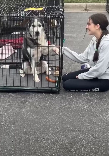 Knowing how much Myla adored dogs, Amber decided to pull over so her daughter could meet some of the pups and give them a little love. As soon as they arrived, Myla jumped out and headed straight for a senior Husky named Bruno, who sat quietly inside one of the kennels.