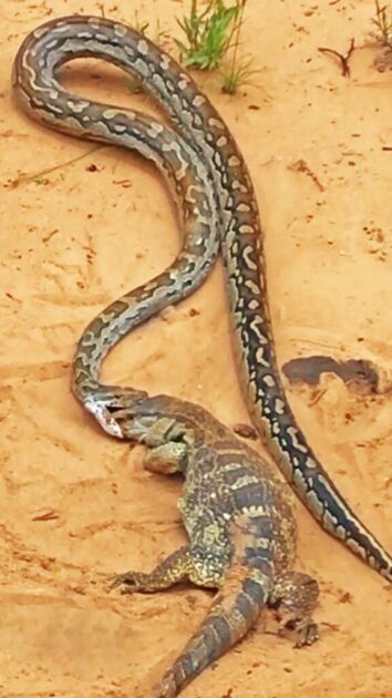 Did the python struggle to swallow the enormous lizard, or did the process begin with quiet, grotesque efficiency? The public is left with only the knowledge that a powerful predator secured a massive win, proving that in the ruthless world of the wild, size and strength always win. But the final, most unsettling act of this incredible sighting remains shrouded in silence and sand.