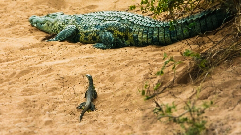 Obviously, this lizard was far too small to prey on the crocodile, but the eggs in the crocodile’s nest were the perfect size for a snack, and by being very, very careful, the monitor might be able to steal some for itself.