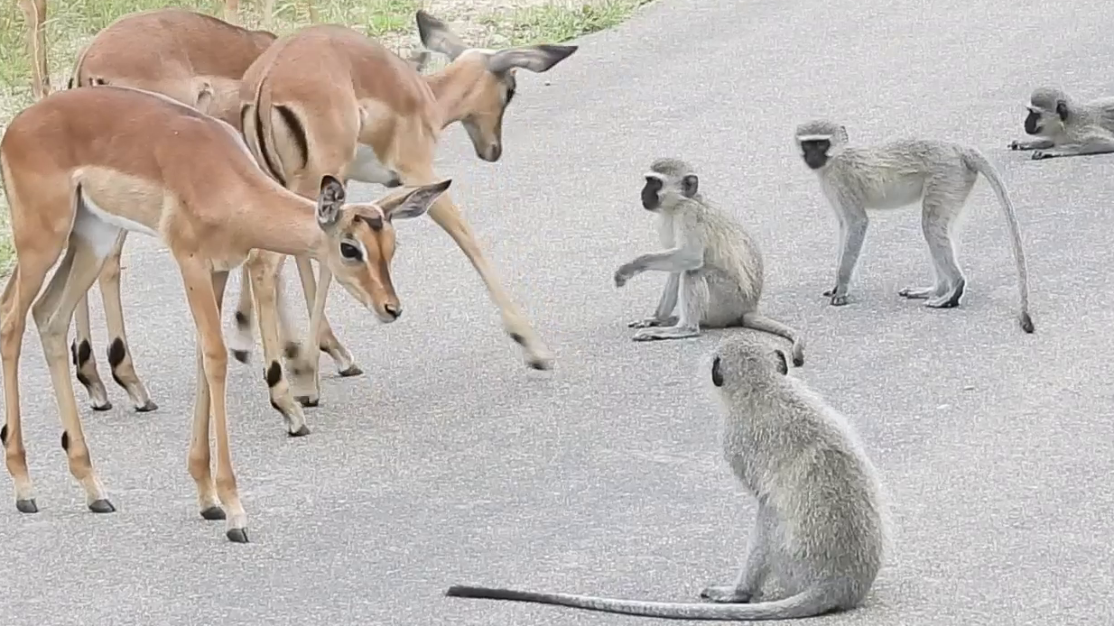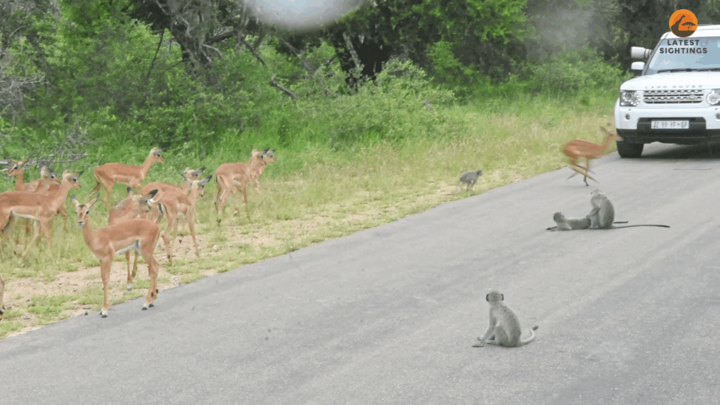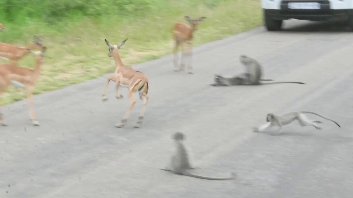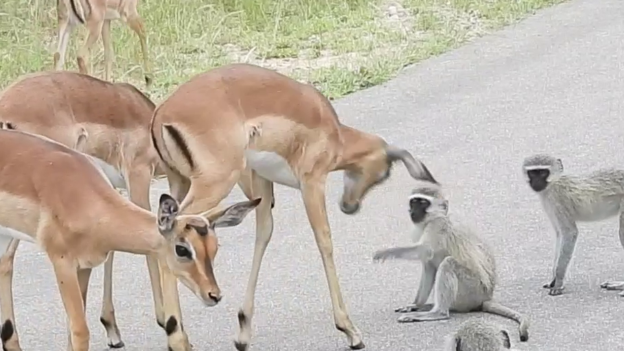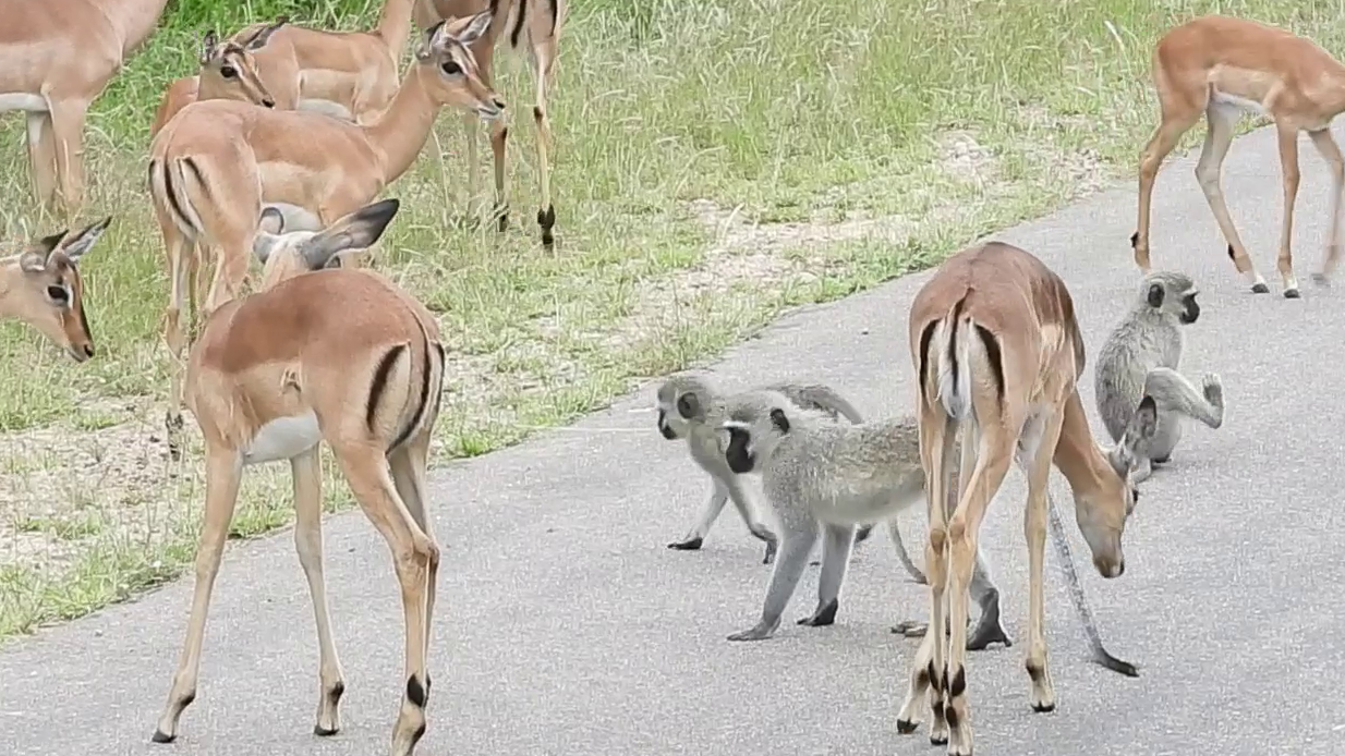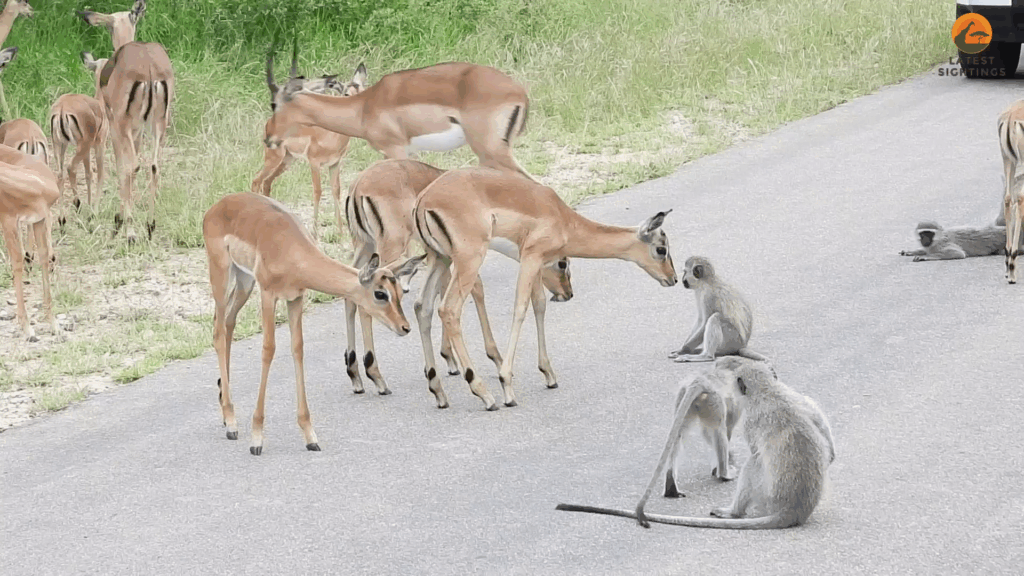 And it is at a time like this that we join the action in Mark’s video. On the side of the road, a group of impala lambs, known as a nursery herd, has come across a troop of vervet monkeys.