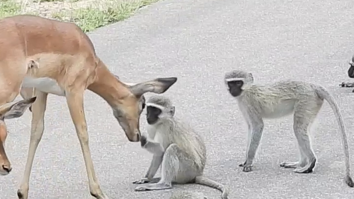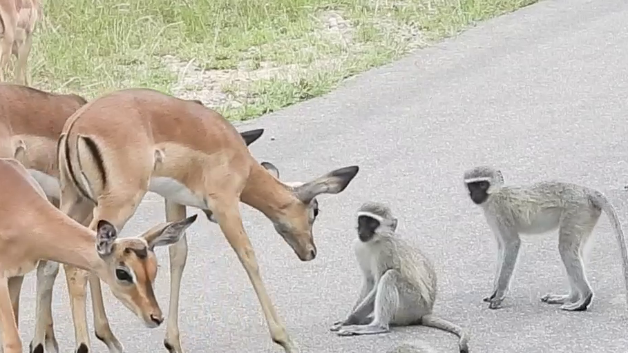 Slender and delicate creatures, impalas are naturally timid. Nevertheless, the lambs feel safe enough in their little herd and tentatively approach the monkeys for a closer look.
