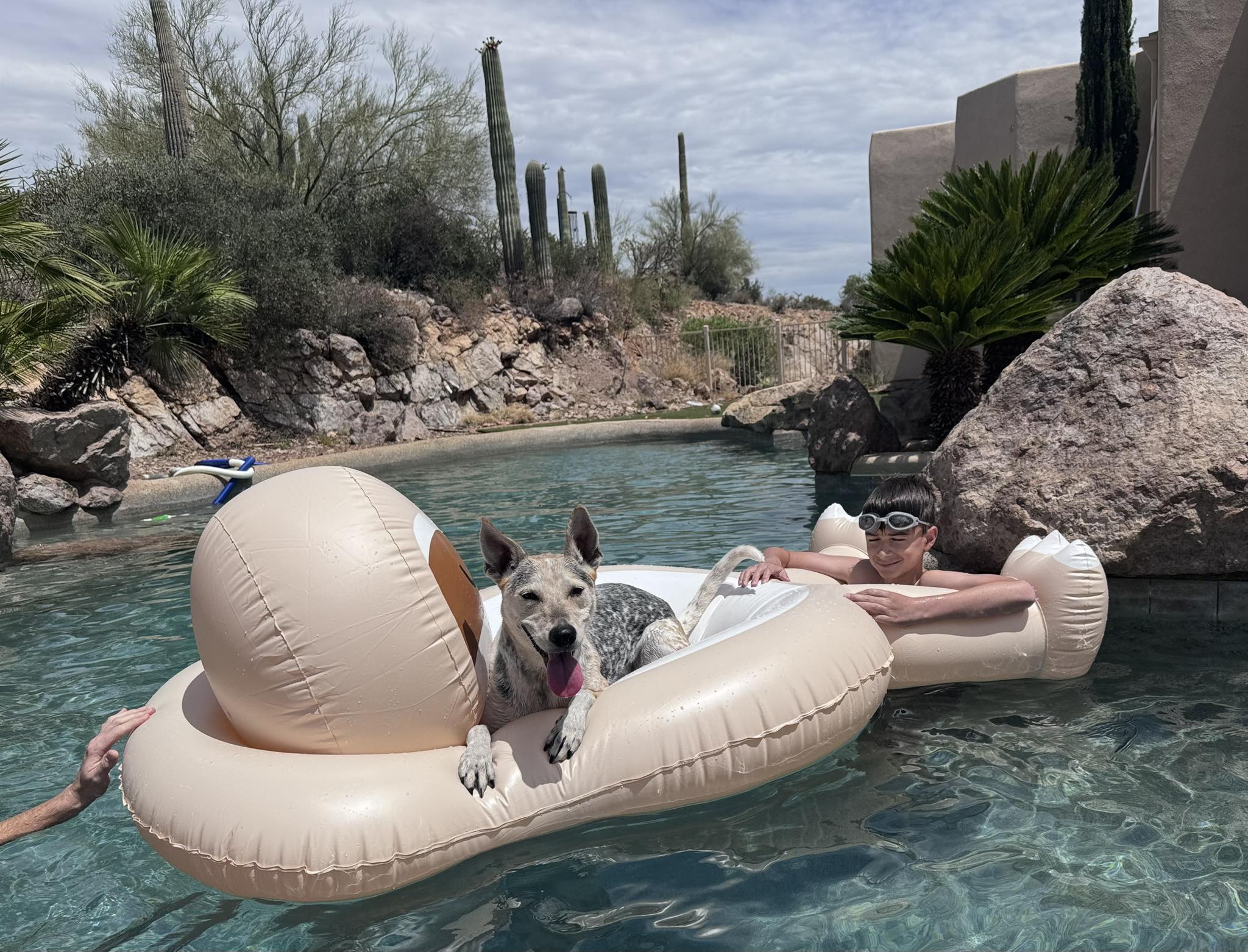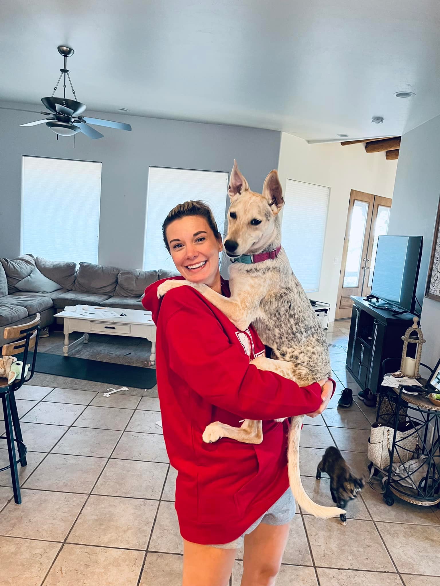 Luna’s new life is filled with frisbee games, splashing in the pool, and sunbathing under the Arizona sky. She even enjoys cuddling with the family’s cats, proving just how well she fits in.