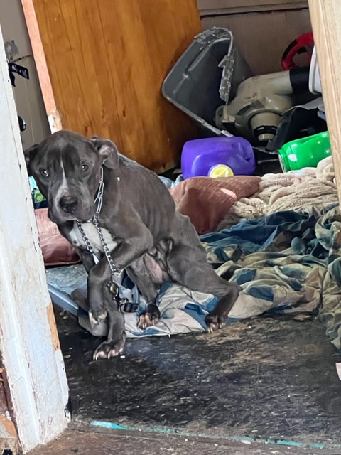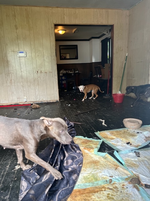 Inside the home, four dogs had been left without food or water for over a week. Among them was one dog in particularly dire condition, a male pup who would later be named Chester.