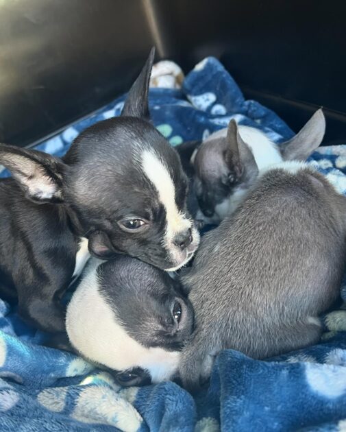 The puppies were in critical condition: cold, weak, and severely underfed. Rescuers believed they were a micro breed of Boston Terrier, each around eight weeks old and all male.