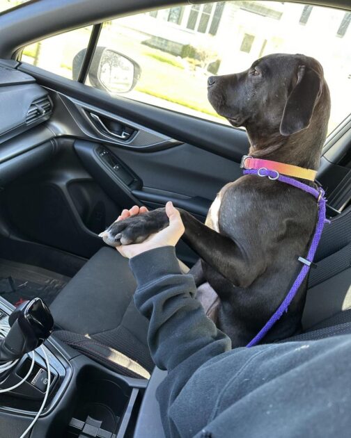As soon as Katie starts the car, Dolly settles in beside her, paw extended, as if asking for comfort through every curve and turn of the drive.