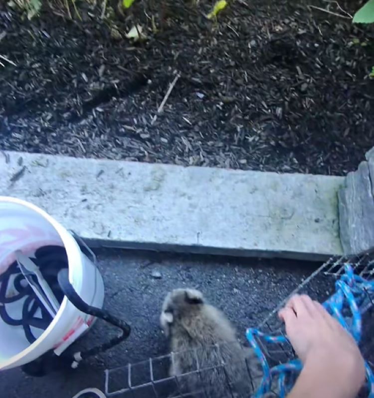 After that was established, he opened the trap door, and then slowly guided the raccoon to the nearby bushes.