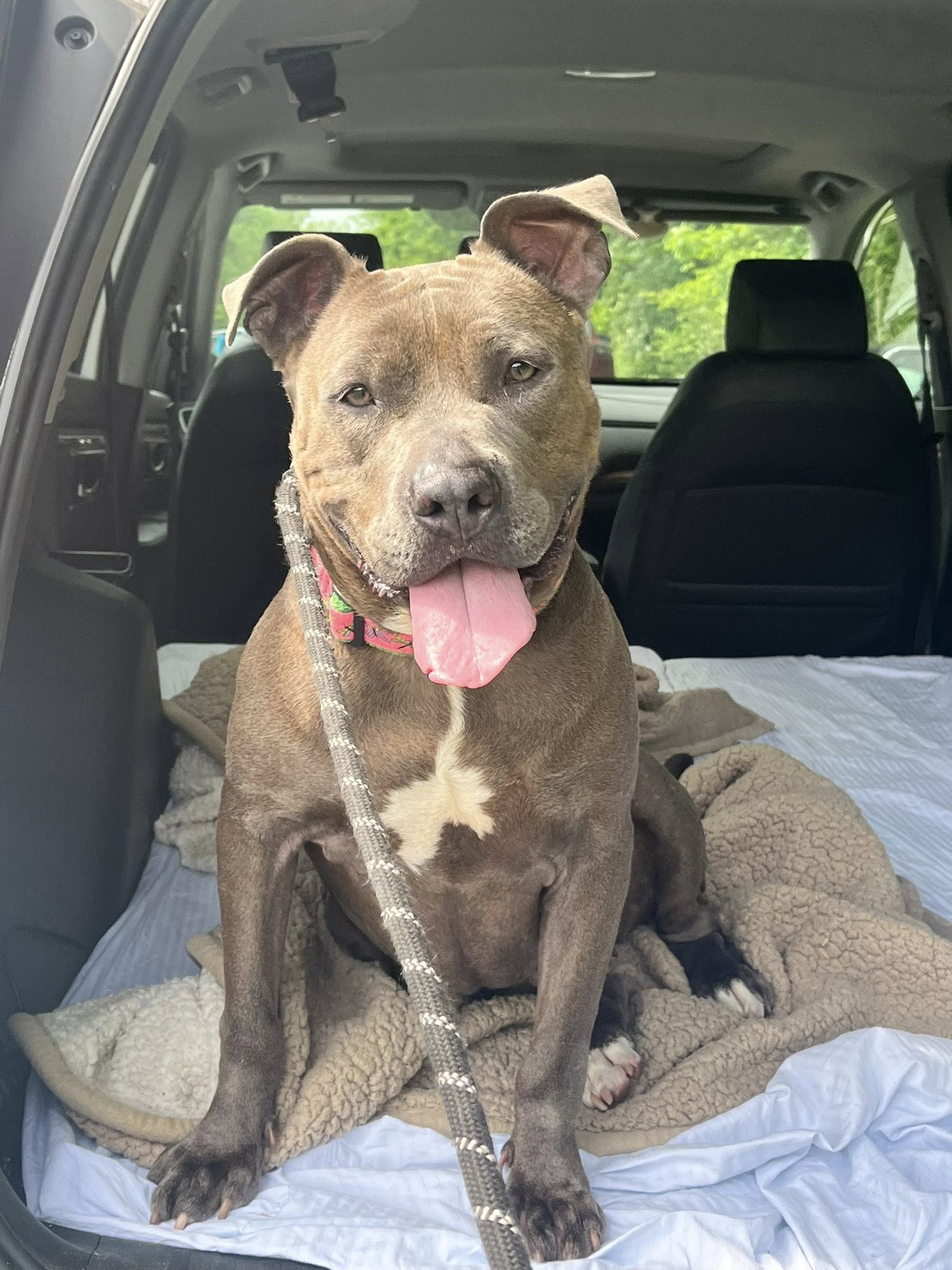 She wagged her tail happily, and just before getting into the car, she turned back one last time, her eyes full of gratitude for the people who had cared for her.