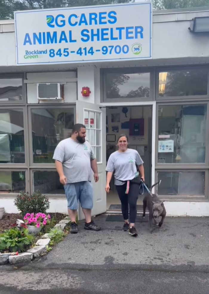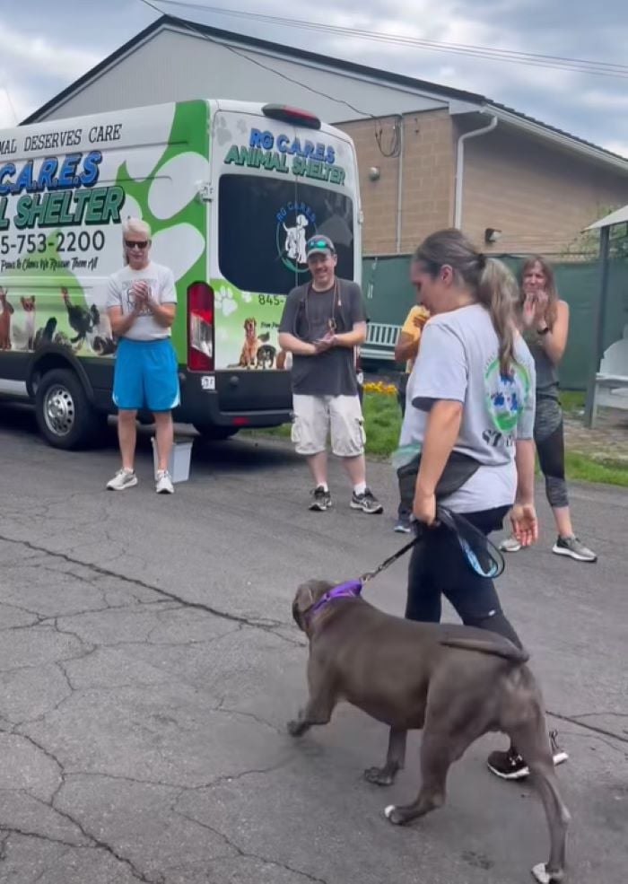 To mark the occasion, the rescuers gathered and applauded as Louise walked toward her adopter.