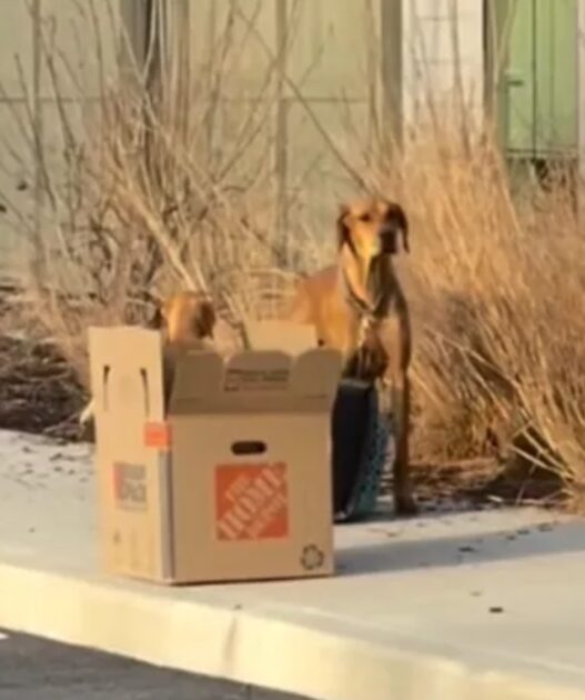 Just a few feet from their entrance, they found a young mother dog tied to a crate that contained four small puppies.