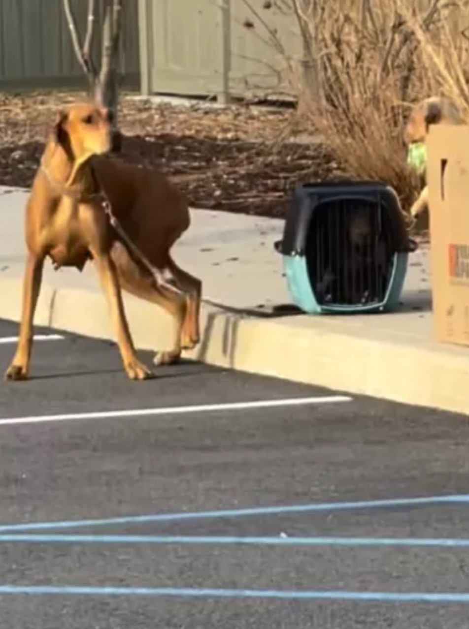 Just a few feet from their entrance, they found a young mother dog tied to a crate that contained four small puppies.