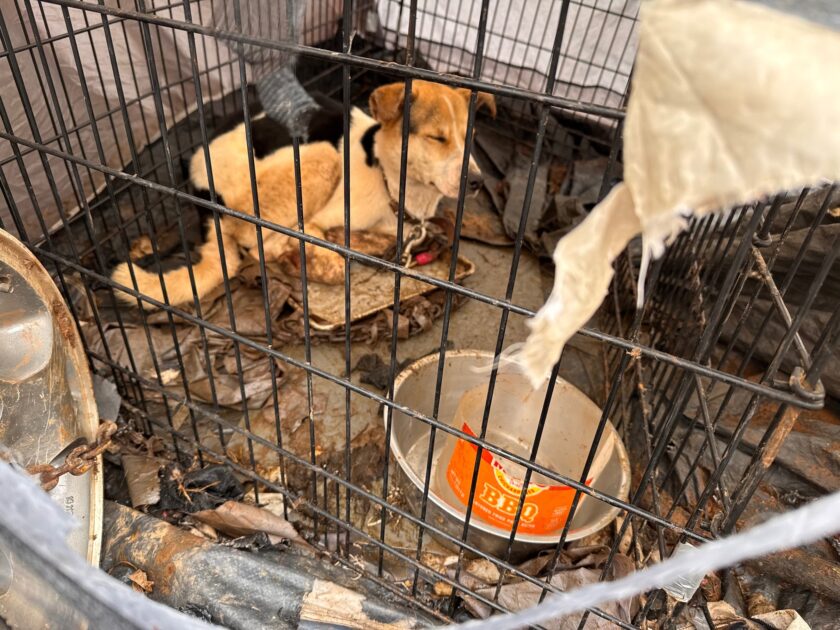 Inside the crate, an old baking sheet served as her only place to lie down, offering little comfort or relief.
