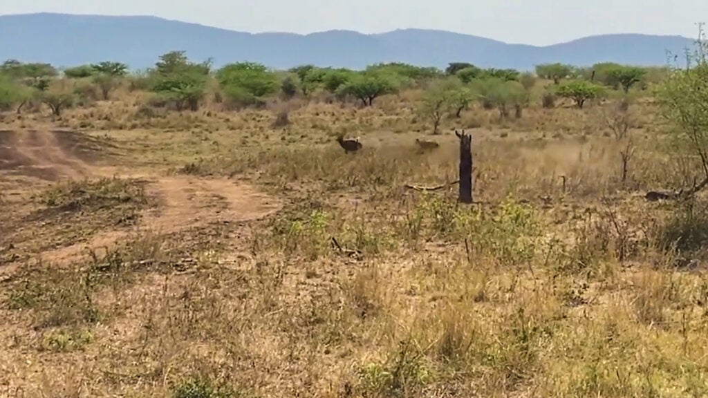However, seconds later, an nyala bull bursts onto the scene. It would appear that it is aware of the lion’s presence and is attempting to flee to the thick bush nearby