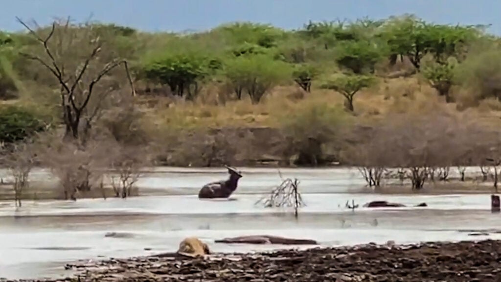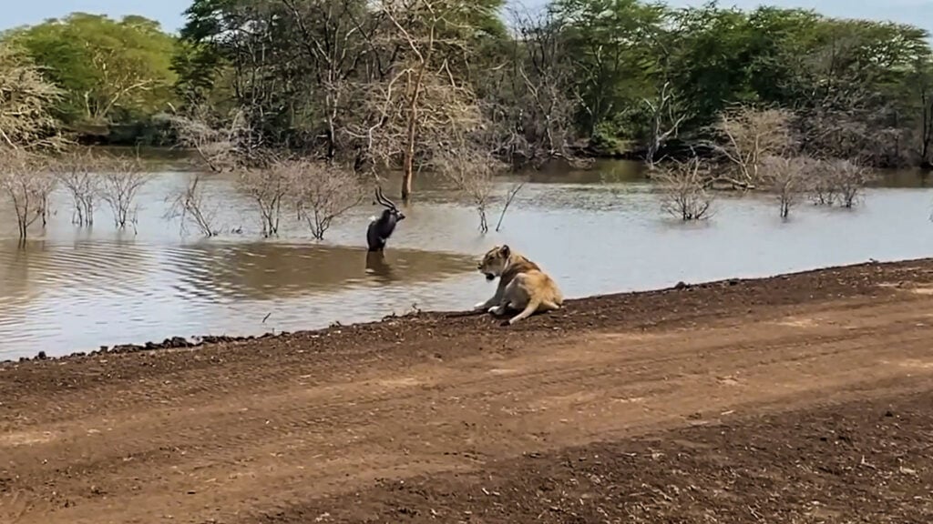 This is really not the antelope’s day. On the bank, the lioness has lain down, content to wait for the nyala to leave the water.